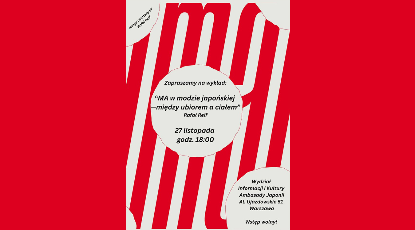 Zapraszamy na wykład pt. „MA w modzie japońskiej – między ubiorem a ciałem”, który wygłosi pan Rafał Reif, badacz mody japońskiej. Współczesna moda japońska zostanie przedstawiona jako fenomen kulturowy, omówione zostaną również takie modowe zagadnienia jak koncepcja przestrzeni (MA), relacje między ubiorem a ciałem, materiały, techniki czy formy. Po wykładzie odbędzie się sesja pytań i odpowiedzi.